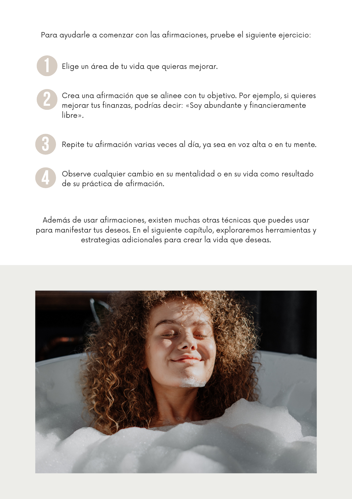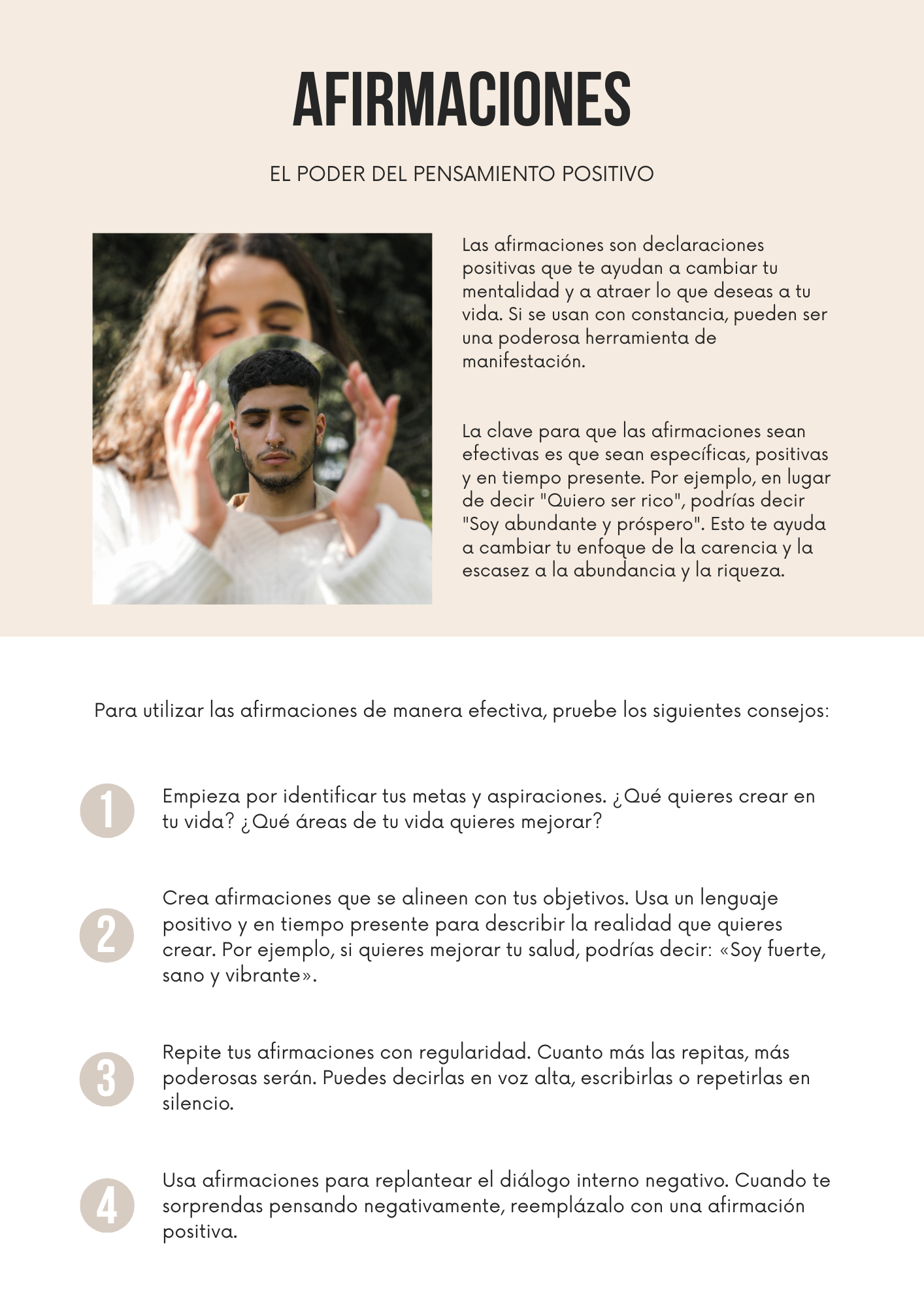 Con el Workbook de Manifestación, transformarás tus pensamientos limitantes en afirmaciones poderosas. A través de ejercicios prácticos, empezarás a cambiar tu diálogo interno y a alinear tu mente con la energía de abundancia, confianza y merecimiento.